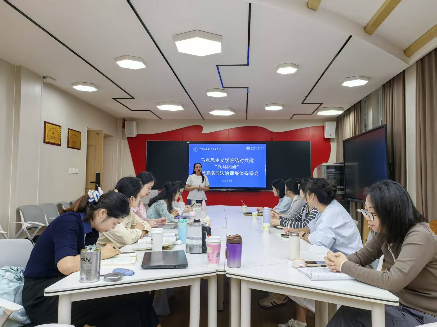 为深入贯彻习近平总书记关于思想政治理论课建设重要论述,落实中共四川省委教育工委、四川省教育厅关于开展四川省高校马克思主义学院结对共建行动的文件精神,推动马克思主义学院和思想政治理论课建设内涵式发展。9月29日,学院马院与四川长江职业学院马院联合开展结对共建“兴马同研”《思想道德与法治》课集体备课活动。学院马院思想道德与法治课教研室陈蕾老师围绕“绪论:担当复兴大任,成就时代新人”这一专题进行说课,两院思想道德与法治课全体授课教师参与研讨。